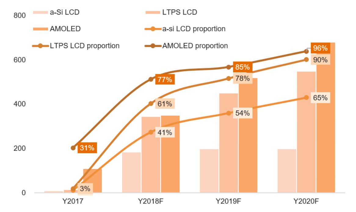 縱觀2017年下半年和2018年上半年的面板市場,智能手機(jī)面板領(lǐng)域全面屏逐漸普及。借助品牌和面板廠商的推動,全面屏標(biāo)準(zhǔn)快速得到整個產(chǎn)業(yè)鏈的認(rèn)可,如今大部分新發(fā)布的智能手機(jī)都已經(jīng)配置了全面屏面板,而且未來這樣的趨勢還將持續(xù)。