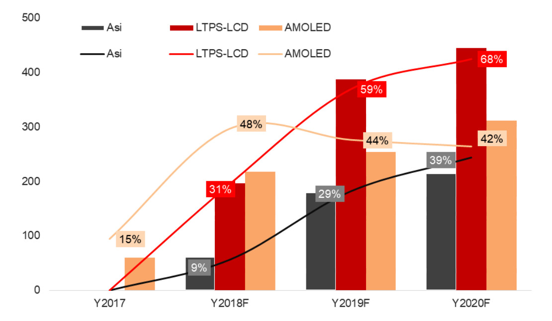 因此,我們預(yù)計從2019年起,無開槽全面屏設(shè)計的手機(jī)產(chǎn)品將逐漸增多,尤其是在高端產(chǎn)品領(lǐng)域?qū)⒂休^為明顯的增長。而這將對在高端手機(jī)領(lǐng)域占有優(yōu)勢的AMOLED面板形成顯著推動作用。根據(jù)群智咨詢(Sigmaintell)的預(yù)測,AMOLED面板中異形屏產(chǎn)品的滲透率在2018年達(dá)到峰值后在2019年將出現(xiàn)萎縮,無開槽全面屏及開孔全面屏將逐漸蠶食異形全面屏的市場份額。而LTPS LCD及a-Si LCD在未來一段時間內(nèi)異形屏仍是較為經(jīng)濟(jì)的顯示解決方案。預(yù)計到2020年,LTPS LCD面板產(chǎn)品中異形屏的滲透率將達(dá)到68%的水平,而定位較為低端的a-Si LCD面板產(chǎn)品中異形屏的滲透率也將達(dá)到39%。